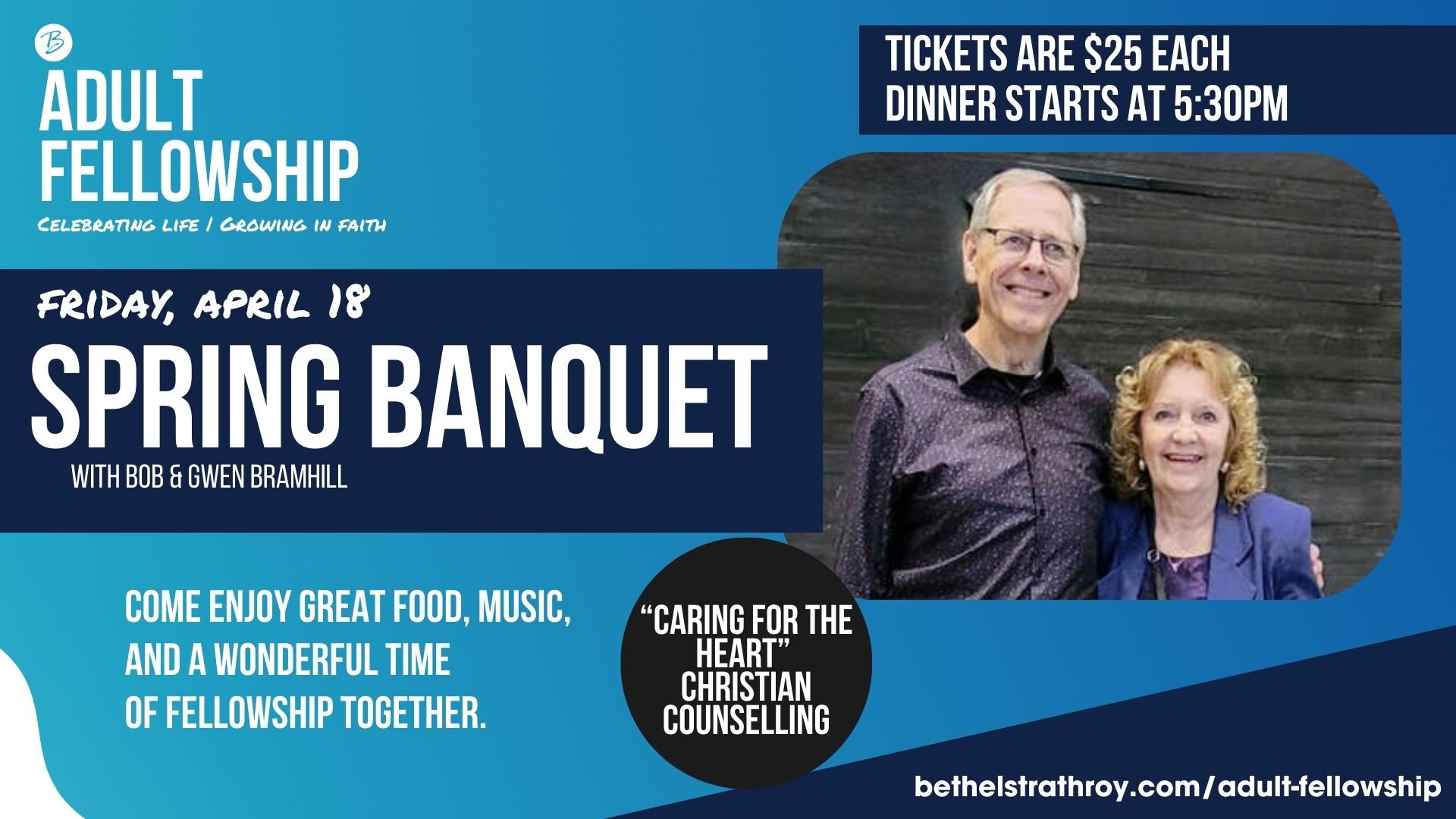 We’ll have a catered dinner, followed by live music from Bob and Gwen Bramhill. We’re thrilled to welcome them back to share musically with us as well as share about Caring for the Heart Christian Counselling ministry in which they are involved. Tickets are $25, and are available at the Welcome Centre or the Church Office.